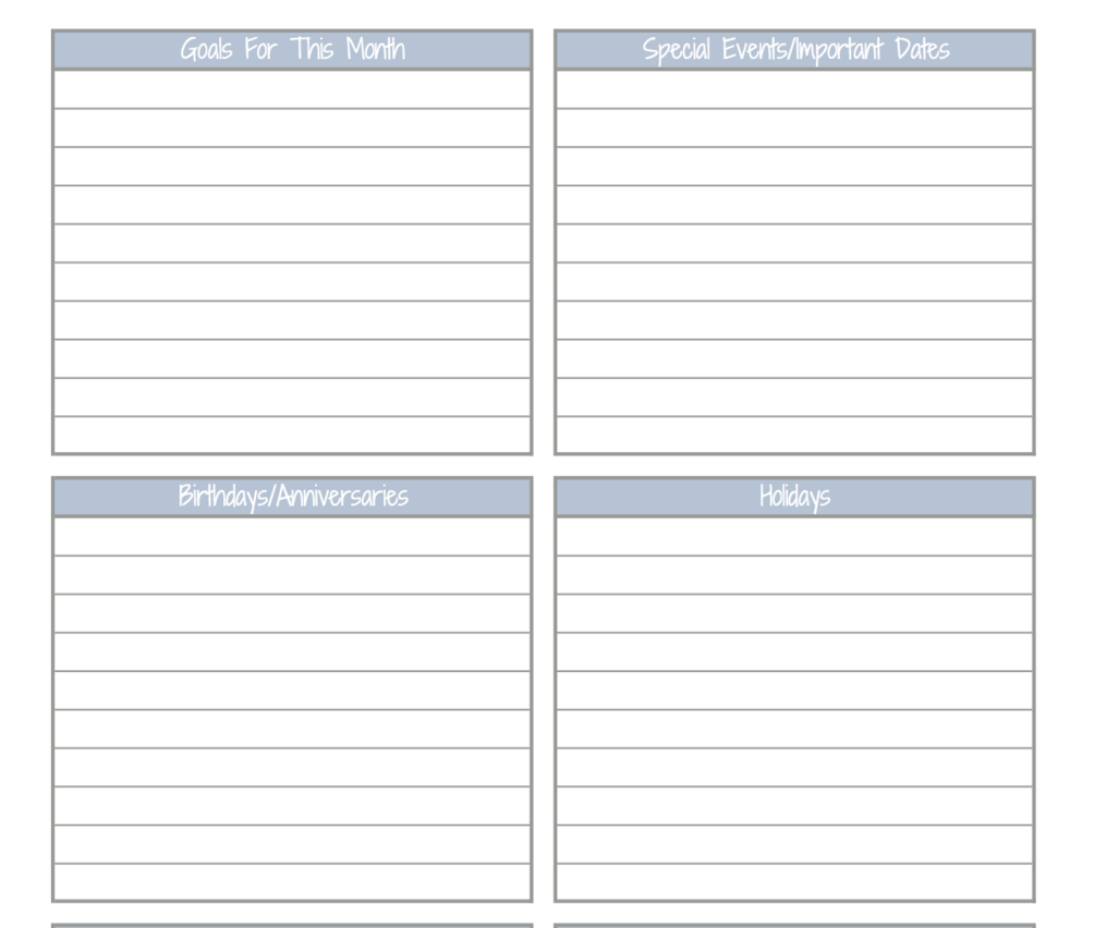 For those who like a functional monthly cover, this dashboard provides a month at a glance. There is a place to write your goals, special events and important dates, birthdays/anniversaries, holidays, prayer focus and the things you're grateful for. All six colors that coordinate with the monthly calendars are included (peach, aqua, purple, blue, red, and green).
